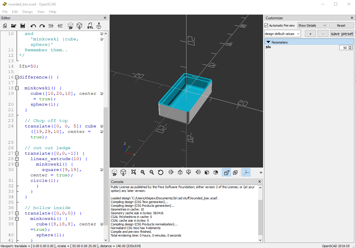 OpenSCAD doesn't look like much. It has a window with three panes. On the left is the Editor, where you write the text that defines your part: "Put a cube here. Put a cylinder there. Drill a hole in the cylinder." In the center is the Viewer, where you can see your creation from different angles and at different distances. On the right is the Customizer, a neat little thing you can use to modify your design on the fly without having to rewrite the text in the Editor window.